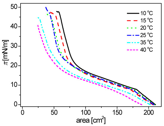 Surface pressure isotherms (π(A)) for the synthetic sebum mixture recorded in the temperature range 10–40 °C.