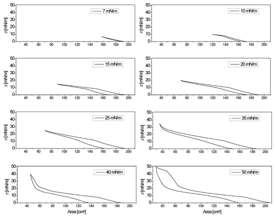 Surface pressure (π(A)) hysteresis (compression-expansion samples) at 21 °C. The values in each panel indicate the surface pressure value where the barrier movement was reversed (maximum compression). The upper curves correspond to compression and lower ones to expansion cycles.