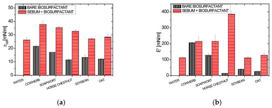 Surface pressure after 100 min, π100, (a) and surface compression elasticity, E’, (b) for the bare biosurfactants and Milli-Q water (black bars with vertical strips) and the synthetic sebum monolayers in contact with the biosurfactants/ Milli-Q water in the subphase (red bars with horizontal strips). All monolayers were compressed to π0 = 30 mN/m prior to introduction of the biosurfactants and the final concentration in the subphase was equal to 1%.