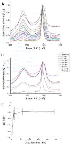 Previous studies by Dimiev and Tour [] proposed that the oxidation of graphite flakes starts at the edges and works in, meaning that the oxidation of individual graphene sheets is not immediately uniform. That mechanism would predict that different regions of a GO sheet would give rise to different Raman spectra, but would not necessarily predict that different sheets within the same GO sample would give very different I(D)/I(G) values. Recognizing that within the same batch of GO there is a large variety of material is of critical importance for application studies using GO. This variation in the degree of oxidation as a function of time was investigated by comparing the Raman spectra of samples taken at different reaction times. For each sample, Raman spectra were obtained from multiple regions and averaged. Figure 1B shows the averaged results using aliquots taken from 0 to 4 h. The increase in the intensity of the D peak relative to the G peak with increasing oxidation time would be expected as the oxidation proceeds []. However, the increase was observed to level out, reaching a maximum after approximately thirty minutes, suggesting that the disruption of the sp2 carbon network was largely finished within the first thirty minutes of oxidation.