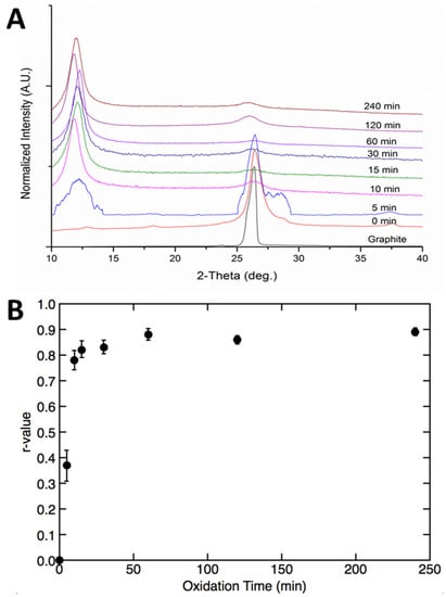 (A) X-ray Diffraction of samples from different oxidation times normalized to show peak shift (B) r-value indicating growth of GO XRD peak relative to the graphite XRD peak (AGO/(AGO + AG)) as a function of oxidation time.