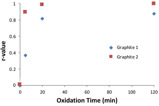 Rate of oxidation of graphite with different starting flake sizes. Graphite 1 was supplied as 50 µm flakes, and graphite 2 was supplied as 15 µm flakes. Time is plotted versus the r-value, derived by comparing the peak areas of each sample at a specific time as obtained by XRD.