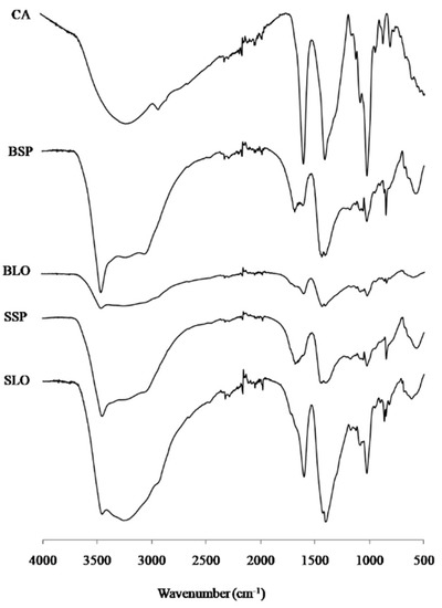 FT-IR spectra of commercial sodium alginate (CA) and alginates extracted from the blades L. ochroleuca (BLO), stipes of L. ochroleuca (SLO), blades of S. polyshides (BSP), and stipes of S. polyshides (SPS).