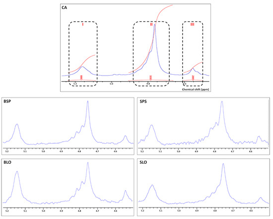 1H NMR spectra of commercial sodium alginate (CA) and alginates extracted from the blades of S. polyshides (BSP), stipes of S. polyshides (SPS), blades L. ochroleuca (BLO), and stipes of L. ochroleuca (SLO).