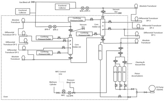 The core is first vacuumed for 24 h before being saturated with the formation brine. Injection is done by a Quizix pump, which displaces a piston accumulator at a controlled rate. The core porosity and permeability are then measured. Gas injection is controlled by a Matheson mass flow controller (MFC).