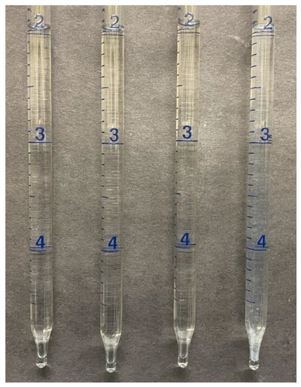 Aqueous stability tests of APG solutions at 45,000 (Left), 85,000, 144,000, and 180,000 ppm (Right). Pipette graduations shown are in mL.