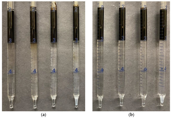 Emulsion tendency tests of APG with Unit-A and Unit-B crude oils at 45,000 (Left), 85,000, 144,000, and 180,000 (ppm) salinity (Right). (a) APG-Unit-A oil before mixing (b) APG-Unit-B oil before mixing (c) APG-Unit-A after mixing and resting for 2 days at 55 °C. (d) APG-Unit-B after mixing and resting for 2 days at 55 °C. Pipette graduations shown are in mL. The red circle in (c) highlights the thin layer of emulsions at 180,000 ppm.
