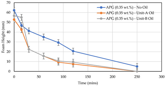 Bulk foam height (mm) as a function of time (minutes) without and with crude oils from Unit-A and Unit-B.