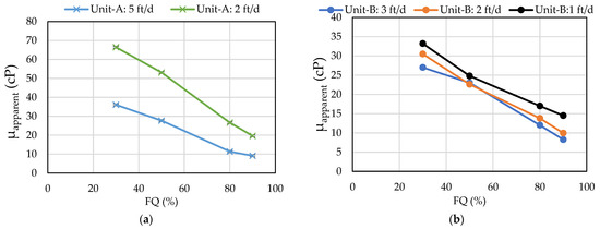 Apparent viscosity in (a) Unit-A Exp 1, and (b) Unit-B Exp 1 as a function of FQ for injection rates varying from 1–5 ft/d.