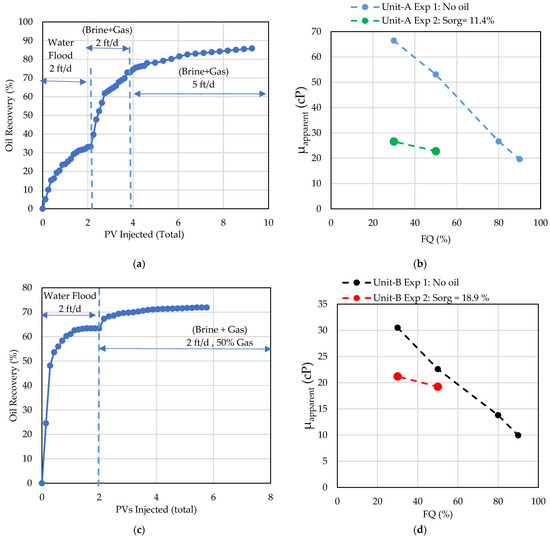 Results of Unit-A Exp 2: (a) oil recovery (%), and (b) apparent viscosity at 2 ft/d and Sorg = 11.4%. Unit-B Exp 2 results: (c) oil recovery (%), and (d) the apparent viscosity at 2 ft/d and Sorg = 18.9%. Gas-brine flooding is at 50% injection gas fraction.