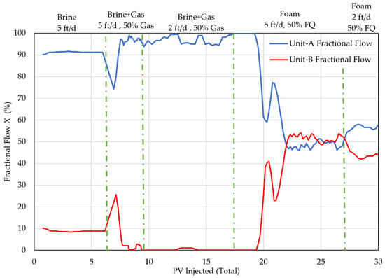 In DI-Exp 2, both cores are oil saturated and aged for 8 weeks. Waterflooding is conducted until the water cut from Unit-A is 100%. Foam injection is then started by co-injecting surfactant solution and gas at 5 ft/d and 50% FQ. Fractional flow (X) and oil recovery/saturation from both cores are measured. For DI-Exp 3, the cores are individually saturated with crude oil from Unit-A and Unit-B and aged again for 8 weeks. DI-Exp 3 follows the same procedure as DI-Exp 2 with the marked difference of limiting the water flood to only 1 total pore volume (PV). This is designed to start the foam flood at an oil saturation being higher than Sor in both cores. PV in the above experiments refers to the combined pore volume from both cores.