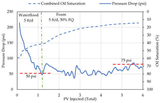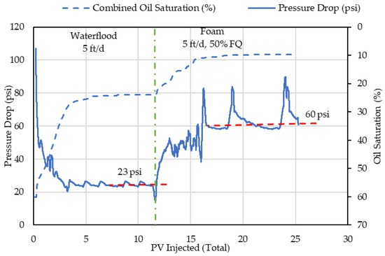 DI-Exp 2 is aimed to prove the viability of foam under the reservoir’s oil wet conditions. The combined oil saturation and system pressure drop for this experiment are presented in Figure 11. A shown in this figure, the waterflood stage reaches a steady state in terms of the system pressure drop (23 psi) and combined oil saturation (24%) within 2–3 PVs. Foam injection at 5 ft/d and 50% FQ is then conducted, which results in a further reduction in oil saturation to 10%, and a pressure drop increase to 60 psi at quasi-steady state. This represents an MRF of 2.6 over the waterflood pressure drop. Most of the additional oil production occurs within the first 3 PVs of foam injection.