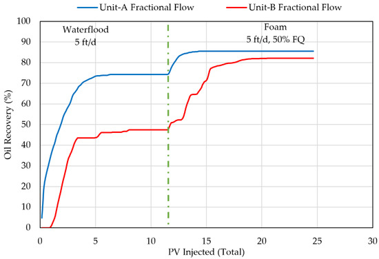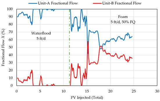 Fractional flow and oil recovery from each reservoir unit are shown in Figure 12 and Figure 13, respectively. In Figure 12, fractional flow during the late time waterflood shows nearly 100% injection water penetrating Unit-A. During this stage most of the oil recovery occurs from Unit-A. As shown in Figure 13, 74% of the oil in Unit-A is recovered within 5 PVs, while only 46% of the oil in Unit-B is recovered.