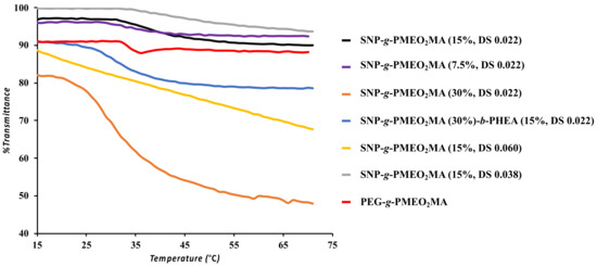 Since the LCAT is concentration-dependent, all the measurements were performed at 1 mg/mL, which is the same concentration at which the DLS analysis was conducted [29]. The weight fraction of PMEO2MA and the DS of the substrates were varied to determine their influence on the LCAT of the samples. The influence of a hydrophilic PHEA block forming a shell on the aggregation of SNP-g-PMEO2MA (15%, DS 0.022) was also investigated. The LCAT values indeed varied with the structure and composition of the grafted SNPs (Table 2). For example, as the PMEO2MA content increased from 15 to 30 wt% at DS 0.022 (or as the PMEO2MA chains became longer), the LCAT decreased from 32 to 20 °C. Interestingly, the LCAT or LCST of thermoresponsive polymers is usually only Mn-dependent in the low Mn range. For example, Lessard et al. observed a mere 2 °C decrease in LCST (from 32.9 to 30.9 °C) as the Mw of poly(N,N-diethylacrylamide) increased from 13 to 58 kg/mol [30]. The change in LCST was even less significant as the molecular weight was increased further, with no change observed from 593 to 1300 kg/mol [30]. As the PMEO2MA content was increased from 7.5 to 15 wt%, the LCAT increased from 28 to 32 °C, which could be due to the ability of these longer chains to hide within the SNPs, delaying the onset of hydrophobic interactions between the chains; but, as the temperature was further increased, SNP-g-PMEO2MA (15 wt%) had a larger drop in transmittance than SNP-g-PMEO2MA (7.5 wt%).