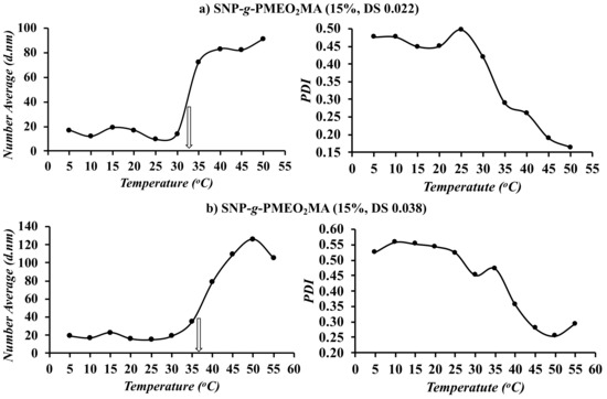 The hydrodynamic diameter of the SNP-g-PMEO2MA samples was monitored as a function of temperature, to explore the use of DLS as an alternate method to determine the LCAT. In contrast to the UV-vis measurements, where the temperature was ramped continuously at 1 °C/min, it was necessary to set a temperature and wait for equilibration before the DLS measurements, which made that method much more time-consuming, such that measurements were only carried out at 5 °C intervals. In spite of the rather crude approach used, a sharp increase in the number-average diameter was observed (Figure 5) at temperatures comparable to the LCAT determined in the UV-vis measurements. This is understandable, as the polymers become hydrophobic at their LCAT, which promotes aggregation. For example, the transition temperatures between 35–40 °C for SNP-g-PMEO2MA (15%, DS 0.038) and 30–35 °C for SNP-g-PMEO2MA (15%, DS 0.022) determined by DLS are consistent with the LCAT obtained by UV-visible spectroscopy (36 and 32 °C, respectively). As expected, the DS 0.022 sample, with longer PMEO2MA chains, began aggregating at a lower temperature than the DS 0.038 sample. In addition, the size distribution of the aggregated thermoresponsive SNPs was narrower than below the LCAT, as shown in Figure 5: The PDI values decreased to 0.16 for the DS 0.022 sample and 0.25 for the DS 0.038 sample, indicating the formation of micellar aggregates of more uniform size. It, therefore, appears that DLS measurements are equivalent to the UV-visible method for the determination of the LCAT, albeit the technique would be much more time-consuming if comparably accurate results were desired, which would require carrying out DLS measurements at less than 5 °C intervals.