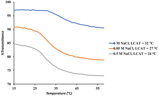 UV-visible spectroscopy was used to evaluate the LCAT of SNP-g-PMEO2MA (15%, DS 0.022) at 1 mg/mL and varying NaCl concentrations. As the concentration of NaCl was increased, the LCAT decreased (Figure 8). When NaCl is present in a solution, the LCAT of thermoresponsive polymers generally shifts to a lower temperature [34]. Because the Na+ cations have a greater affinity for binding to the polymer than the Cl- anions, direct contact between the Na+ ions and PMEO2MA plays an essential role in the LCST change. The ions are known to impact the hydration shell closest to the polymer, not the bulk water structure around it [34]. Indeed, it was shown in a study of PNIPAM with different salts by Du et al. [28] that cations had a significant affinity for the oxygen atom in amide groups, while the anions had no contact with the polymer. The anions of salts are classified as kosmotropic or chaotropic, based on their influence on the LCAT [35]. Kosmotropic anions reduce the LCAT of a thermoresponsive polymer substantially by interacting with water strongly, while reducing polymer-water interactions and hence polymer stability in solution [35]. Chaotropic anions are less efficient than kosmotropic anions at lowering the LCAT, and can occasionally stabilize thermoresponsive polymers in solution. Some examples of kosmotropic anions include CH3CO2−, F−, OH−, HPO4−, CO32−, and SO42−, while examples of chaotropic anions are Cl−, I−, Br−, SCN−, and ClO4− [35]. Thus, the decrease in LCAT from 32 °C in pure water to 24 °C in 0.5 M NaCl observed for sample SNP-g-PMEO2MA (15%, DS 0.022) is attributed to decreased hydration of the PMEO2MA chains in the presence of the Na+ ions.