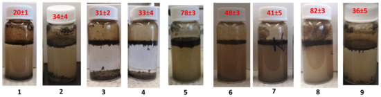 Yang et al. used a shaker to extract bitumen from the IOos sample with PEG-b-PMEO2MA [17]. Since IOos did not contain fines it was relatively easy to extract the bitumen, but PEG-b-PMEO2MA was unable to extract bitumen from SBos. Moreover, the synthesis of PEG-b-PMEO2MA is not commercially viable, and that compound is not biodegradable. We wanted to develop a more environment-friendly and economical system for the extraction of bitumen from oil sands with high fines contents. For example, the SNP-g-PMEO2MA (15%, DS 0.022) used for the extraction contained 85% starch by weight. Furthermore, a tumbler system was used to carry out the bitumen extraction, which is closer to the commercial process being used. A clamp attached to a motor served to tumble the oil sand mixtures in the vials at 53 rotations per minute in an oven maintained at 45 °C (Figure 7). Tumbling ensured better mixing of the polymeric surfactant, the organic solvent, and the aqueous phase for a more efficient extraction process. Extraction with the shaker was also investigated and while the influence of the polymer could be noted, the overall extraction efficiency with the shaker was much lower than by tumbling.
