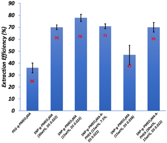 Bitumen extraction efficiency with 15 mg of polymer-grafted SNPs, 0.5 M NaCl, 15 mL of water, and 60 mg of toluene at 45 °C for various polymer-grafted SNP samples.