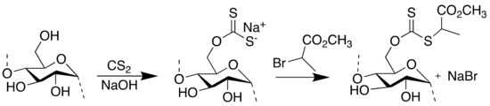 The xanthated SNPs (6.14 g, 37.5 mmol glucopyranose units) were added to deionized (DI) water (19.2 mL) in a 50-mL RBF. The solution was vortexed for 15 min and stirred for 60 min, until the polymer was fully dispersed. Methyl 2-bromopropionate (1.20 mL, 10.8 mmol) was then added dropwise and the flask was placed in a water bath at 80 °C for 40 min. The dispersion turned light yellow by the end of the reaction. The product was collected by precipitation in methanol and suction filtration to obtain a powder that was dried further in a vacuum oven overnight at 60 °C.