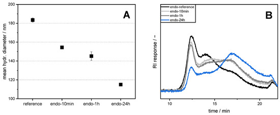 The incubation with endo-PG resulted in significant changes in molecular size distribution and mean hydrodynamic diameter of the SBPs (see Figure 2). The hydrodynamic diameter of the reference sample (endo-reference) was 183 nm ± 2 nm. The longer the enzymatic treatment, the stronger the fragmentation of the pectins, and, accordingly, the smaller the hydrodynamic diameter. Although the differences between SBPs incubated for 10 min and 1 h were minor (hydrodynamic diameters of 154 nm ± 2 nm µm and 145 nm ± 5 nm, respectively), incubation for 24 h resulted in a significantly smaller hydrodynamic diameter (115 nm ± 1 nm).