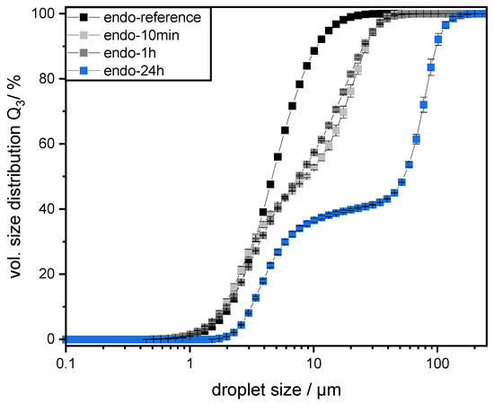 Figure 3 shows the volumetric oil droplet size distributions Q3 of the 30 wt% oil in water emulsions prepared at 400 bar. The use of SBPs with different sizes resulted in significant differences in the droplet size distribution of the prepared emulsions. An increasing shift to larger emulsion droplets was observed with increasing enzymatic degradation. Whereas emulsification with endo-reference showed a d90,3 of 7.4 µm ± 0.1 µm, incubation for 10 min and 1 h resulted in a d90,3 of 17.6 µm ± 0.3 µm and 14.8 µm ± 0.1 µm, respectively. The strong fragmentation that occurred in endo-24h resulted in further coalescence during emulsification and another significant increase in droplet size (d90,3 = 76.4 µm ± 4.2 µm). Moreover, the emulsion prepared with endo-24h showed a bimodal size distribution, which might be the consequence of a high coalescence rate.