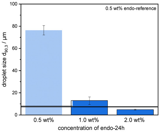 Droplet sizes d90,3 of emulsions prepared with 0.5 wt%, 1.0 wt%, and 2.0 wt% endo-24h (24 h enzymatic treatment using endo-polygalacturonanase), respectively. A reference line was drawn for 0.5 wt% endo-reference. The emulsions were prepared at pH 3 with 30 wt% mct oil at 400 and 1000 bar.