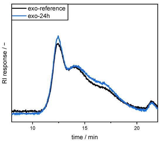 The molecular weight distributions of exo-reference and exo-24h are shown in Figure 7. For both samples, the HPSEC-RI elution patterns showed broad molecular size distributions. Despite the enzymatic treatment, no significant shift towards smaller molecular sizes was observed. Other differences in the molecular size distributions were also not very pronounced. Because cleavage occurred exclusively at the non-reducing free ends of the homogalacturonan, the hydrodynamic diameter of SBPs changed only slightly (186 ± 4 nm for exo-reference vs. 175 ± 5 nm for exo-24h).