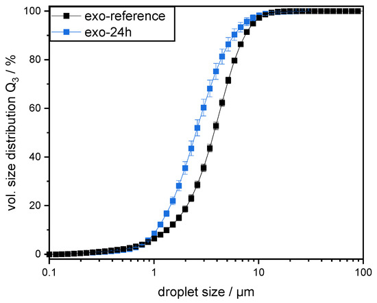 Volumetric oil droplet size distributions Q3 of emulsions (30 wt% mct oil in water) prepared with 0.5 wt% exo-reference and 0.5 wt% exo-24h, respectively. The emulsions were prepared at pH 3 using a high-pressure homogenizer at 400 bar.