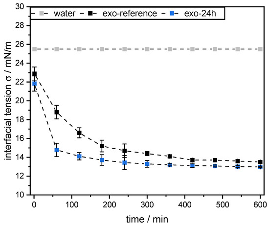 Figure 10 shows the dynamic interfacial tension, which initially decreased more rapidly when exo-24h was used, compared to exo-reference. This supports the statement of the faster adsorption of SBPs after modification with exo-PG. As a result, when using exo-24h, the coalescence during emulsification is significantly reduced and smaller droplets are obtained than when using exo-reference.