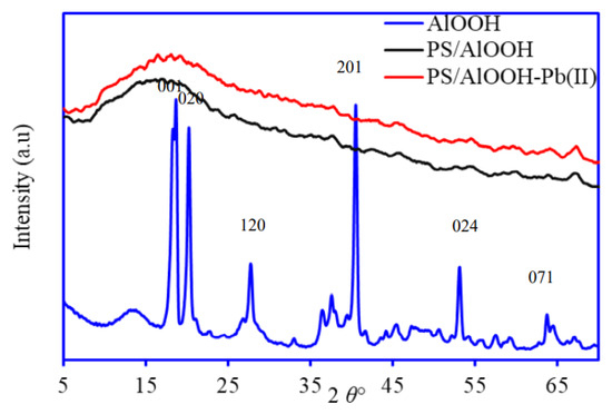 XRD pattern of the AlOOH, PS/AlOOH, and Pb(II)-adsorbed PS/AlOOH.