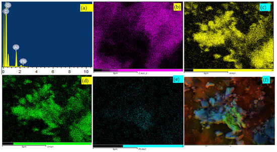 (a) EDX analysis and elemental mapping of the Pb-adsorbed PS/AlOOH hybrid adsorbent; (b) C, (c) Al, (d) O, (e) Pb, and (f) mixed elements.