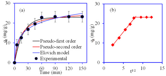 (a) Adsorption kinetic plots for Pb(II) removal; (b) intra-particle diffusion plot (pH—5.6, solution volume—20 mL, Pb(II) conc.—100 mg/L, temp.—32 °C, PS/AlOOH mass—0.05 g).