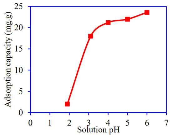 The scavenging of Pb(II) onto PS/AlOOH was performed at pH 2.0 to 6.0 to investigate the connection between solution pH and uptake capacity. The pH study results shown in Figure 8 indicate that the adsorption of Pb(II) improved with the rise in the solution pH, and the highest Pb(II) adsorption onto PS/AlOOH was noted at pH 6. The adsorbed Pb(II) amount increased rapidly from pH 2.0 to 4.0, and, after that, very slow adsorption was observed. In a highly acidic medium, Pb(II) scavenging was low due to competition between positively charged excess H+ and Pb(II) toward the same binding sites of PS/AlOOH. With the increasing solution pH, the negative charge density on the PS/AlOOH surface increases, which favors the binding of positively charged Pb(II) ions [31,32]. The possible ion exchange and complexation reactions on the surface of PS/AlOOH may occur as follows:
