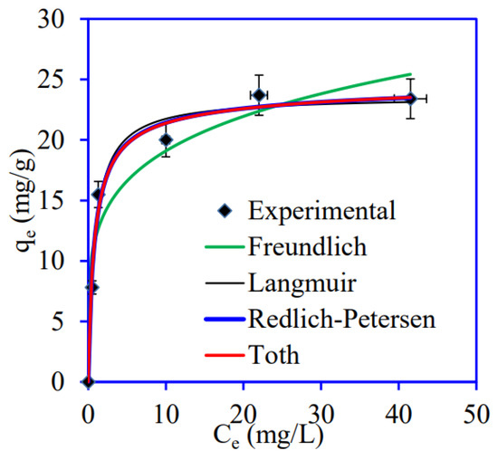 Langmuir, Freundlich, Redlich–Peterson, and Toth adsorption isotherms were applied to find the PS/AlOOH hybrid adsorbent’s adsorption behaviors and surface properties. The non-linear equations for the Langmuir, Freundlich, Redlich–Peterson (R–P), and Toth isotherm models, respectively, can be expressed as follows: