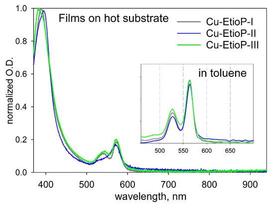EAS of copper(II) etioporphyrin films on hot substrates, inset—spectra of solutions in toluene from [1].