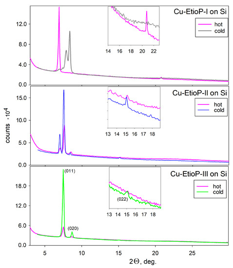 In the previous article, we tentatively assigned the peak at 6.9 degrees to a metastable phase that appears in the films of I-isomers of metal-etioporphyrins [1]. It now becomes clear that this phase is quite stable and tends to dominate in hot-grown Cu-EtioP-I films. For a strong diffraction peak at 6.9 degrees arising in a hot-grown film, the rocking curve (omega scan) can be reliably measured. The full width at half maximum is 0.6 degrees, which indicates a very high degree of texture. This fact disagrees with the morphology of Cu-EtioP-I film as viewed with SEM/AFM in Figure 2 and Figure S2, and we cannot offer a consistent explanation of such a disagreement. Perhaps, the internal structure of a “ball of threads” is actually rather complex, such that it allows molecules to retain their preferred orientation with respect to the substrate. Since the lattice parameters for this thin-film phase are unknown, it is not possible to determine the orientation. In the XRD patterns of the films of II and III isomers, the intensity of all peaks related to hot-grown films decreases, whereas the number and relative intensity of the peaks remain unchanged—Figure 3. Given equal nominal thickness of molecular layers in all batches, this can be explained by decreased strength of the crystallites texture in hot-grown films, which, again, is not consistent with the SEM/AFM images in Figure 2 and Figure S2. Crystallinity of Cu-EtioP-III is stronger suppressed by deposition on a hot substrate: the intensity of peaks is reduced by a factor of five (Figure 3).