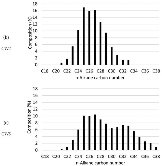 n-Alkane carbon number distribution of wax blends: (a) CW1, (b) CW2, and (c) CW3 obtained by gas chromatography.