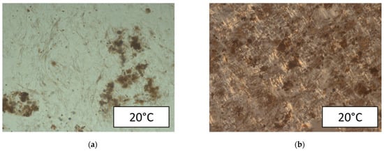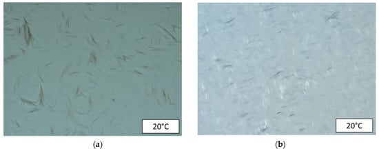 CPM images at 20 °C of oils (a) 2A and (b) 3A. Wax crystals were not observed for oil 1A under the same conditions.