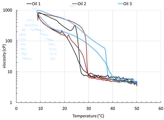 Viscosity as a function of the cooling/heating cycle 50 °C → 8 °C → 50 °C for oils 1, 2, and 3, measured by applying a constant shear of 25 s−1 and a cooling/heating rate of 1 °C/min.