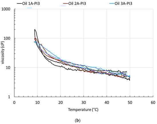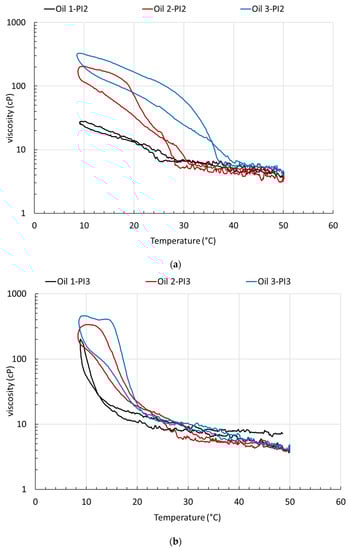 Viscosity as a function of the cooling/heating cycle 50 °C → 8 °C → 50 °C for oils (a) 1A-PI2, 2A-PI2, and 3A-PI2 and (b) 1A-PI3, 2A-PI3, and 3A-PI3, measured by applying a constant shear of 25 s−1 and a cooling/heating rate of 1 °C/min.