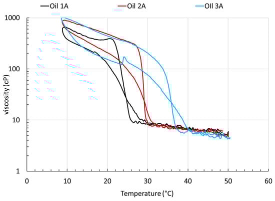 Viscosity as a function of the cooling/heating cycle 50 °C → 8 °C → 50 °C for oils 1A, 2A, and 3A, measured by applying a constant shear of 25 s−1 and a cooling/heating rate of 1 °C/min.