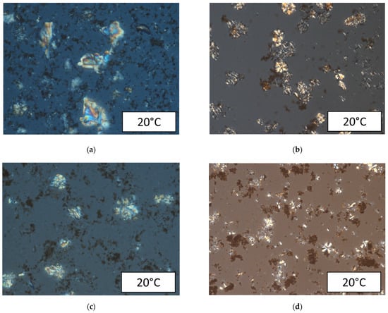 CPM images at 20 °C of oils (a) 2-PI2, (b) 3-PI2, (c) 2-PI3, and (d) 3-PI3. Wax crystals were not observed for oils 1-PI2 or 1-PI3 under the same conditions.