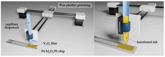 As already mentioned, sol-gel technology is compatible with a wide range of thin film deposition techniques. For example, it is often combined with spin-coating and dip-coating [25,29]. Recently, however, more and more attention in the field of film deposition has been paid to printing technologies, such as ink-jet printing [28,33,34], microextrusion printing [35,36] or pen plotter printing [30,37,38]. These processes provide high reproducibility of the microstructural and functional characteristics of the films and simplify the production of multicomponent coatings, including those with complicated geometries. In addition to these, pen plotter printing has other advantages, such as affordability, availability of consumable materials, possibility of printing on surfaces of different texture and roughness, absence of strict requirements regarding the rheological properties of the so-called functional inks, and convenience of coating using precursor solutions for sol–gel synthesis of various nanomaterials. The pen plotter printing process can be described as follows. First, a pen, often stuffed inside with a special foamy ink absorber, is filled with functional ink. Then, the filled pen is put into a special holder on a plotter, which moves along the X and Y planes, normally without controlled movement on the Z axis, so this technique is only applicable to film preparation [39].