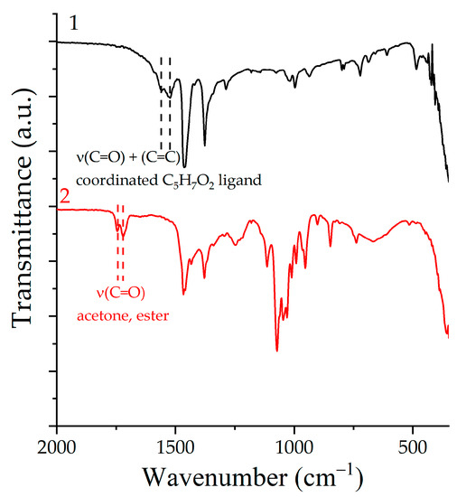 The results of IR spectroscopy (Figure 3) confirm the conclusions drawn from the analysis of the electron spectra. Thus, absorption bands with maxima at 1522 and 1560 cm−1, characteristic for vibrations of the C=O and C=C groups in the coordinated acetylacetonate ligands, observed on the spectrum of vanadyl acetylacetonate, are absent on the spectrum of the complex solution after its heat treatment. At the same time, an absorption band appears with two maxima (at 1743 and 1720 cm−1) related to vibrations of the carboxyl group C=O in the products of chelate ligand destruction (acetone and butyl acetate). There are also a few other differences between two spectra, such as slight change in the shape of absorption bands situated in the regions of ~1300–1500 cm−1, 900–1100 cm−1, and also varying intensity of the bands in these regions. Slight changes in shape can be attributed to the changes in complex geometry and structure due to chelate ligand substitution with butoxyl species, while intensity in these regions might be different due to a slightly different size of aliquot taken for IR spectroscopy.