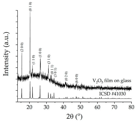 X-ray powder diffraction analysis (XRD) was used to study the crystal structure of the oxide film obtained as a result of heat treatment (Figure 4). As can be seen from the diffractogram for the oxide film deposited on a glass substrate, the reflexes present agree well with the ICSD card #41030 for orthorhombic V2O5 and confirm that the chosen regime of heat treatment of the material leads to its crystallization and oxidation into vanadium pentaoxide. A full-profile analysis of this diffractogram was also performed, resulting in the calculation of the average size of crystallites and lattice parameters. Thus, the average crystallite size in this case was 54 ± 4 nm, and the lattice parameters have the following values: a = 11.502(3) Å, b = 3.559(1) Å, c = 4.388(2) Å, the cell volume was 179.61 Å3. When comparing the results with the literature data (a = 11.512 Å, b = 3.564 Å, c = 4.368 Å) [40,41], it can be noticed that in our case the cell is somewhat compressed by parameters a and b and expanded by parameter c. Due to the fact that the average crystallite size reaches a relatively large value, the degree of crystallinity of the material is quite high, respectively, the differences in the cell parameters are probably not due to the incomplete crystallization process. Consequently, they can be explained by the peculiarities of the structure and composition of the oxide, i.e., the presence of defects. It can be assumed that the obtained material has an increased concentration of oxygen vacancies, which leads to a decrease in parameters a and b. The increase in the parameter c is also presumably due to the high content of oxygen vacancies: the parameter c is related to the distance between the layers in the crystal structure of the oxide, and the layers are linked by the interaction between the oxygen at the top of the pyramidal structure surrounding the vanadium in one layer and vanadium from the neighboring layer [42].