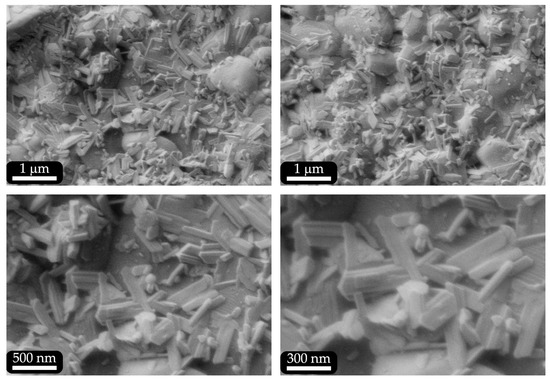 SEM study of the microstructure of the oxide film on the PAP surface showed (Figure 5) that the film, although not completely covering the substrate area (which can be seen from presence of bare alumina grains of ~1 μm size), is continuous and formed by well-defined, elongated nanorods. Furthermore, some V2O5 particles are combined into agglomerates, fused by their lateral facets. Agglomeration and fusion of the nanorods is most likely caused by the heat treatment at 300 °C. The average length of the rods is 259 ± 25 nm and the width is 68 ± 6 nm. Comparison of the particle size observed by SEM with the average crystallite size determined by XRD suggests that the oxide nanorods are mostly composed of several crystallites.