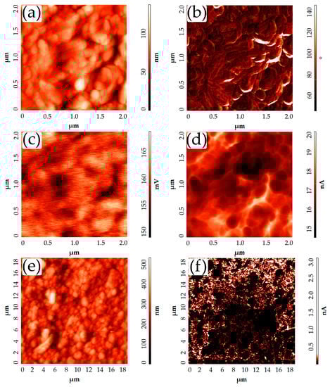 The results of scanning spreading resistance microscopy (SSRM) (Figure 6e,f) further demonstrate the contact between the V2O5 particles over the entire area of the film: the bright areas in the image correspond to the areas where the current passes between the probe and the sample.