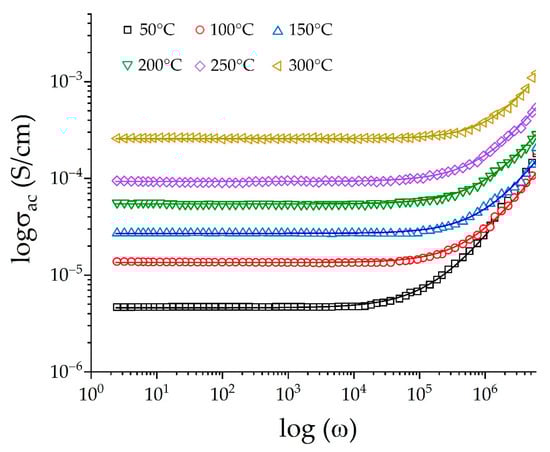 Frequency dependences of AC conductivity in the temperature range 50–300 °C.