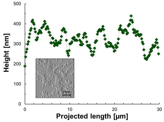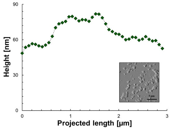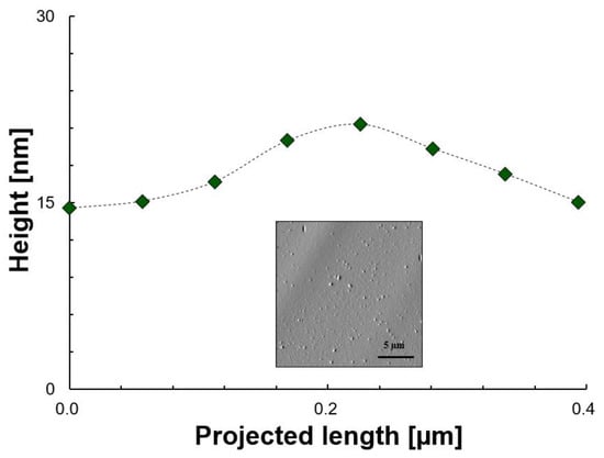 Height as a function of the projected length and morphology of aggregates/sediment of model 1 after n-heptane and toluene evaporation. The green icons are the experimental points, the dashed line is for illustrative purposes only and the image is to show the area where data was extracted.