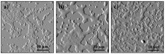 The effects of the inhibitors/dispersants on model 1 and model 2 are shown in Figure 6 and Figure 7, respectively. The average height (AH, a parameter that describes the changes in height of the surface) and the mean square roughness (MSR, a parameter that gives an indication of aggregate size in three dimensions) extracted from the images with Gwyddion® are presented in Table 5. The first aspect to note is that for both model systems, the final conformation is bigger in size (compared to the case without any additive) for APR, whereas similar sizes are obtained for PIBSA. This is evidenced by a higher AH and MSR for APR compared to the reference value at 0% and conversely lower values for PIBSA. This could be an indication of the different phenomena present: larger sizes could represent the action of a dispersant and so the larger aggregate is viewed as a loosely bound asphaltene cluster-dispersant complex that remains soluble. The presence of an aromatic motif on the APR molecule does not provide (which might not be the intended action mechanism) sufficient interaction energy for this compound to bind to the asphaltene cluster. On the other hand, similar/lower sizes could represent the action of an inhibitor, where some monomers are attached to the asphaltene clusters, preventing an increase in their size and further aggregation via active site deactivation (or crowding) and keeping the entire complex fully solubilized []. There is evidence from isothermal titration calorimetry (ITC) of similar molecules providing strong interaction energies () with asphaltene model compounds, suggesting H-bonding from the PIBSA molecule and stacking from the asphaltenes [,].